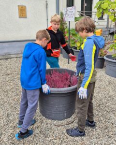 We began by talking about why plants matter – at home, in the classroom, and around the school. Then it was time for action! The students planted parlor palms that purify and humidify the air, and colorful heathers appeared in the schoolyard.