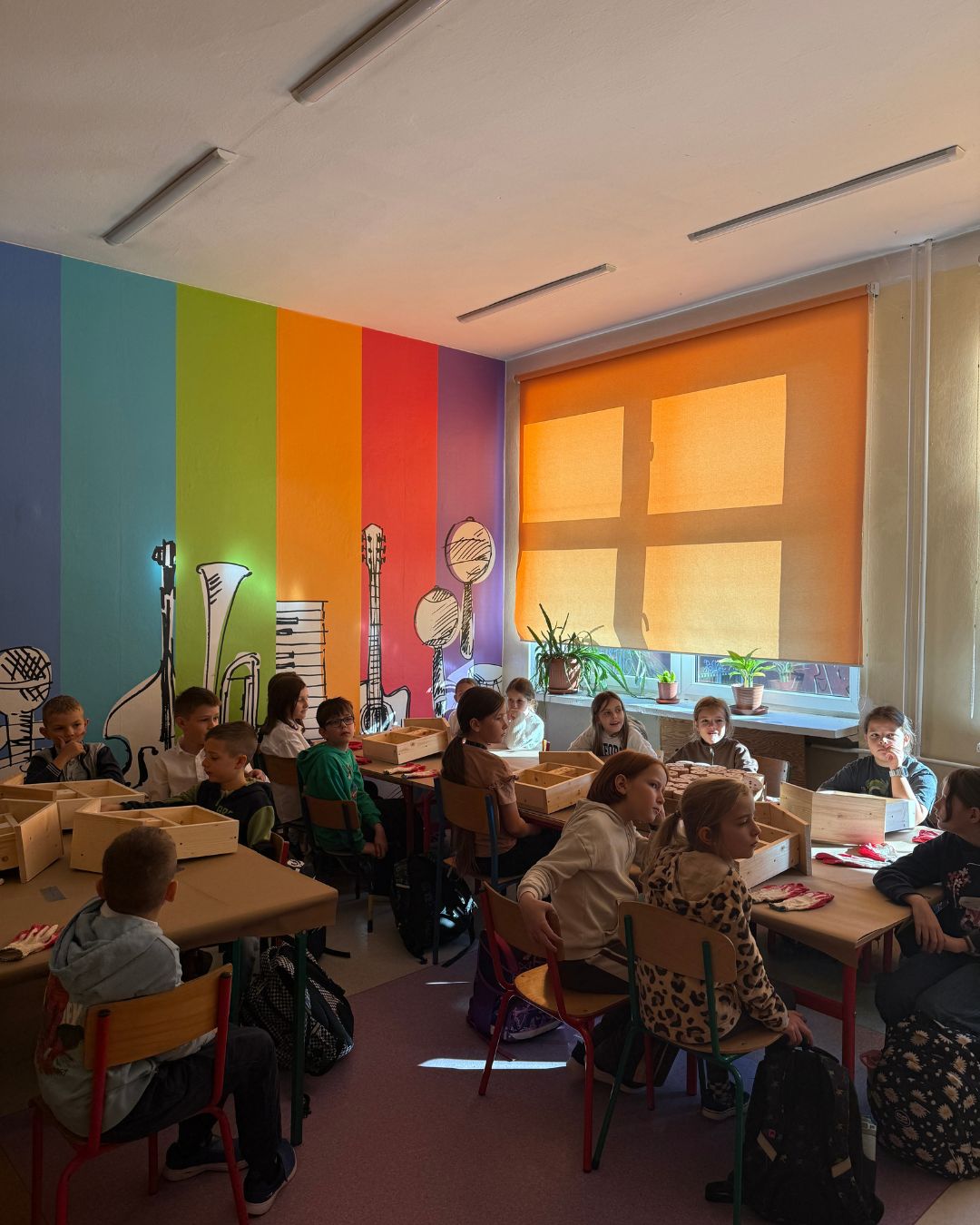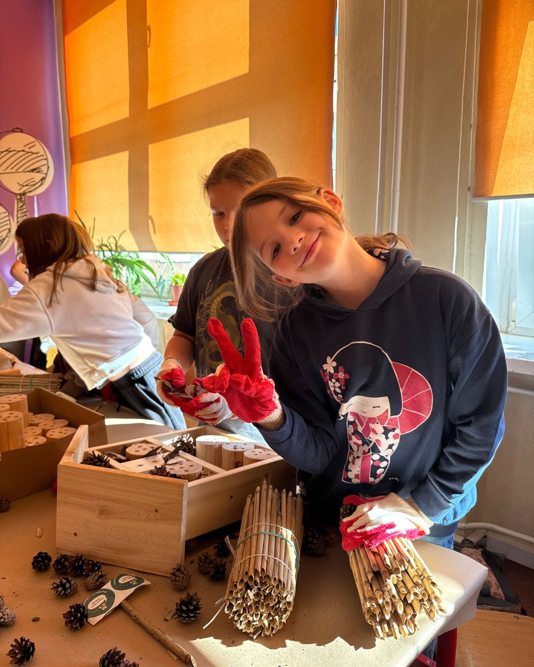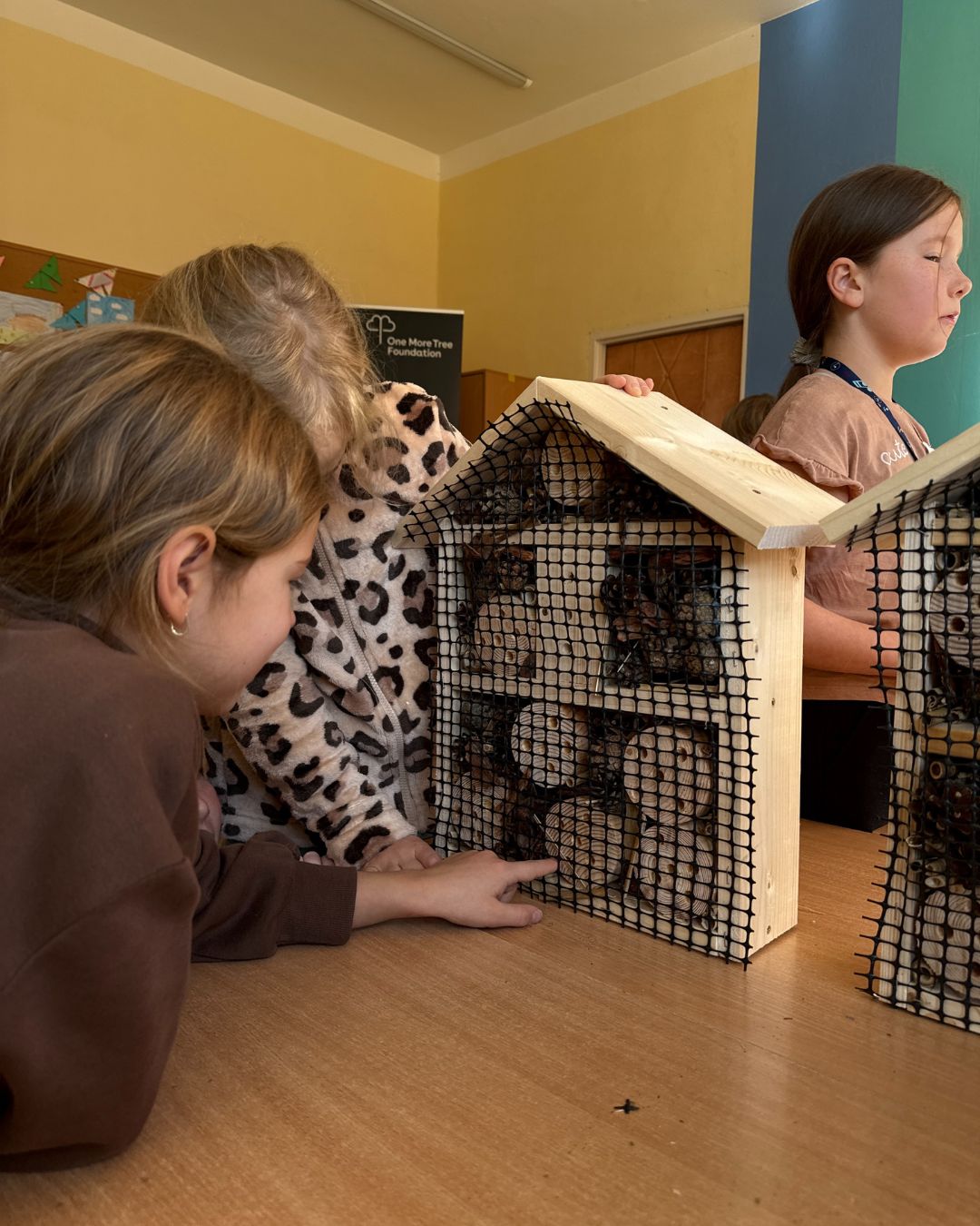 During the workshops, students could not only build insect hotels but also understand how significantly such actions influence the local ecosystem. Seeing the finished houses placed around the schoolyard became a source of pride and a clear demonstration that even small initiatives can have a meaningful impact. This experience teaches responsibility, mindfulness, and awareness of the natural world around us.