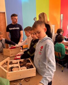 On November 7, 2025, we organized environmental workshops at School Complex No. 20 in Wrocław (Primary School No. 65), during which students built their own insect hotels. The constructed houses were then placed in the schoolyard, where they will now support local pollinators and other beneficial insect species. This activity not only enriched the school’s surroundings but also allowed students to step into the role of caretakers of nature.