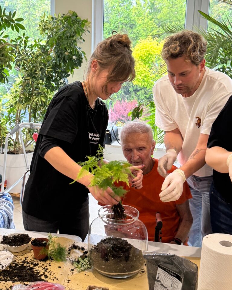 Plantar, colocar musgo y piedras, seleccionar las composiciones — todo ello requirió precisión, paciencia y compromiso. Fue también una forma excelente de conectar con la naturaleza y reflexionar sobre el equilibrio que proporciona el entorno natural. Para las personas mayores, fue una valiosa oportunidad de crear algo bello que les acompañará durante mucho tiempo, como adorno para la habitación y como recuerdo de un día compartido.