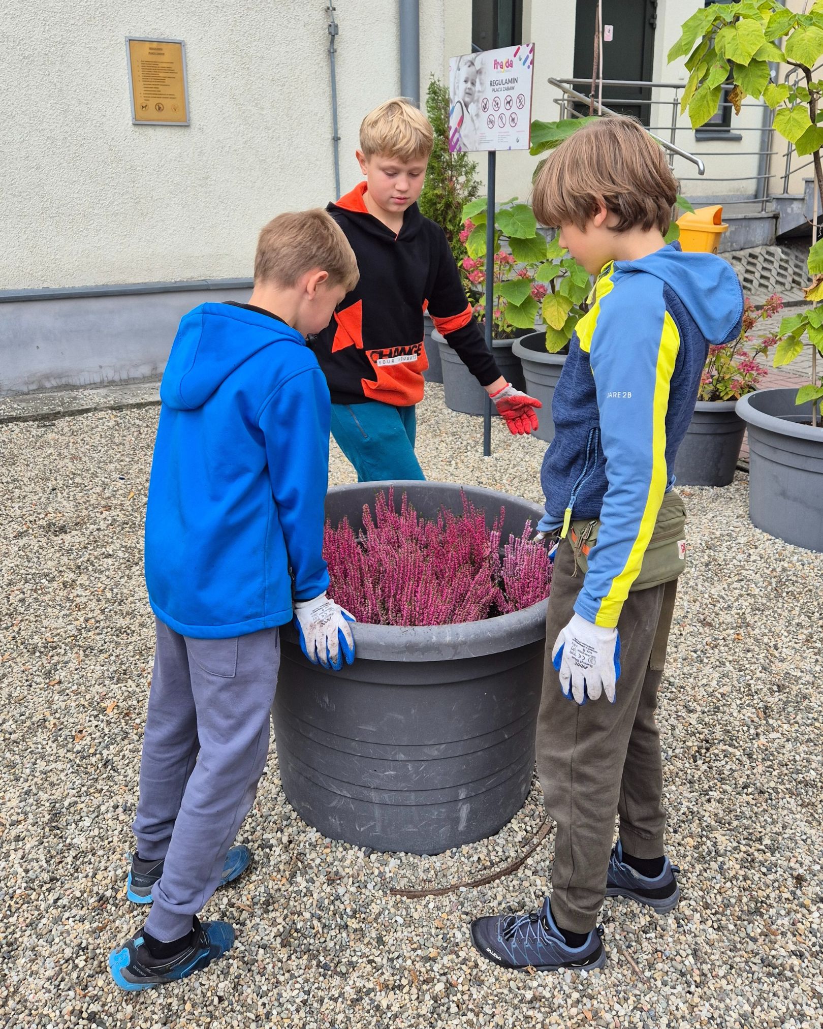 Después pasamos a la acción. Los estudiantes plantaron palmas de salón, que purifican y humedecen el aire, y en el patio escolar aparecieron coloridos brezos. Un poco de tierra en las manos, muchas risas y aún más satisfacción.