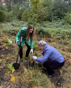 A la plantación se unieron representantes de instituciones locales, participantes de los Talleres de Terapia Ocupacional Caritas de Gliwice, así como vecinas y vecinos de Zabrze. Plantamos más de 1.000 árboles, de los cuales alrededor del 80% son especies caducifolias autóctonas (robles, hayas, tilos, arces y carpes) y el 20% árboles frutales (manzanos, perales, cerezos, guindos y serbales), que en el futuro servirán de alimento para aves e insectos.