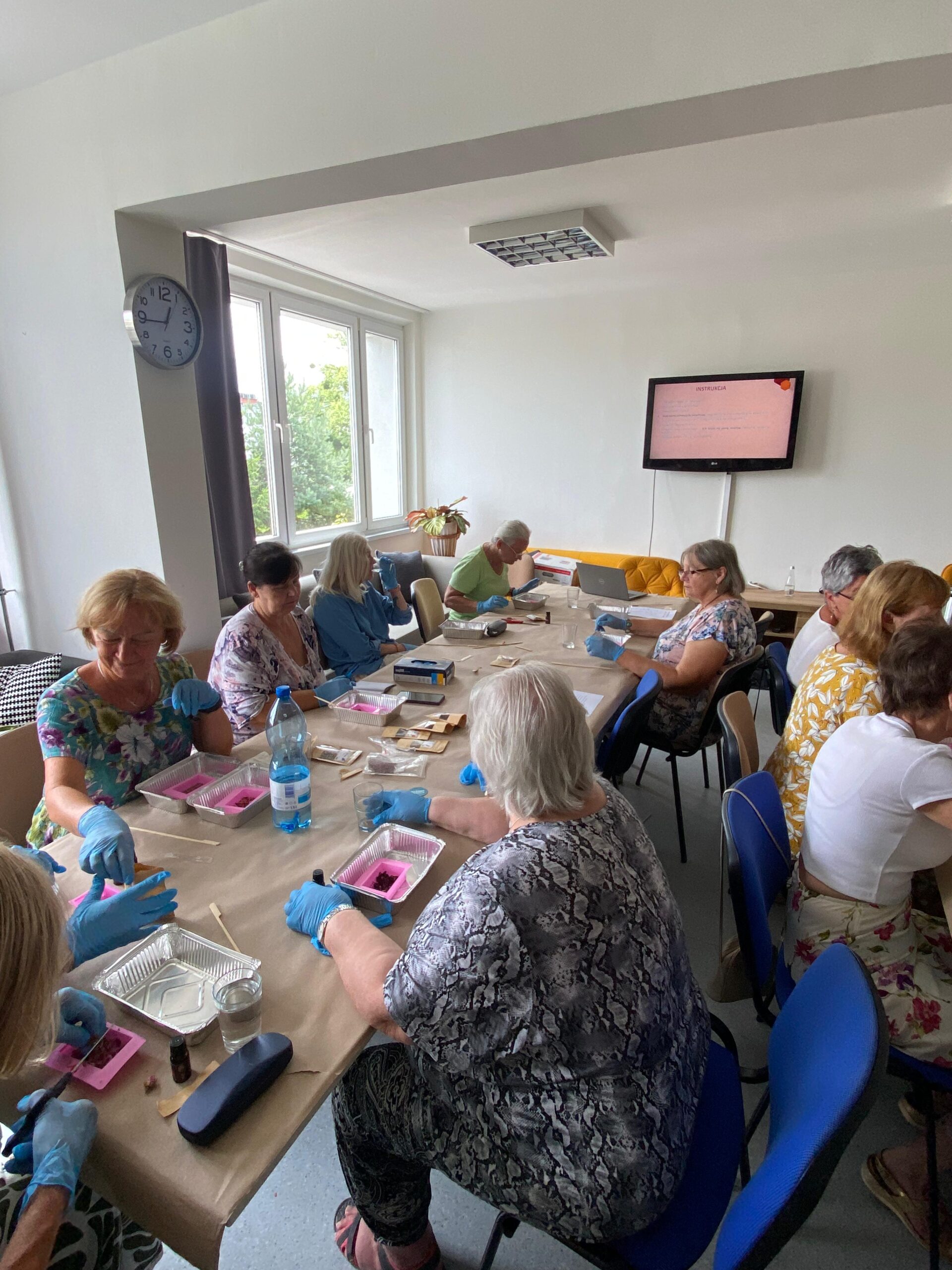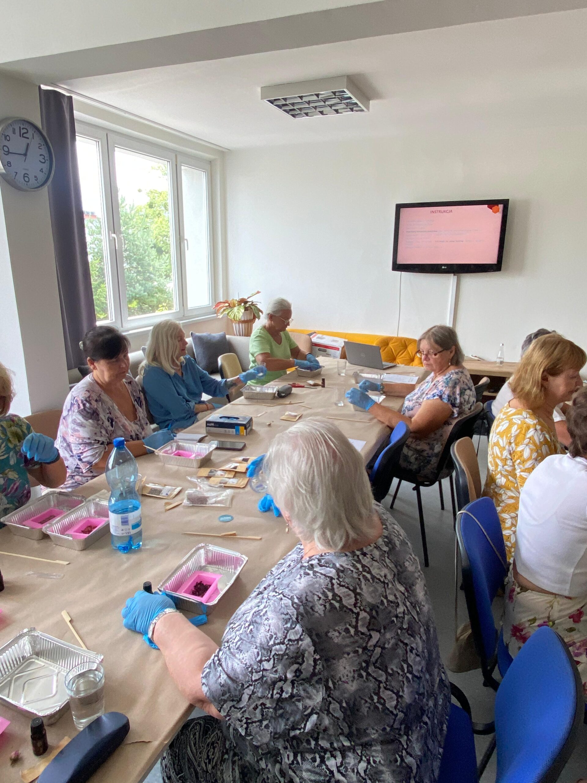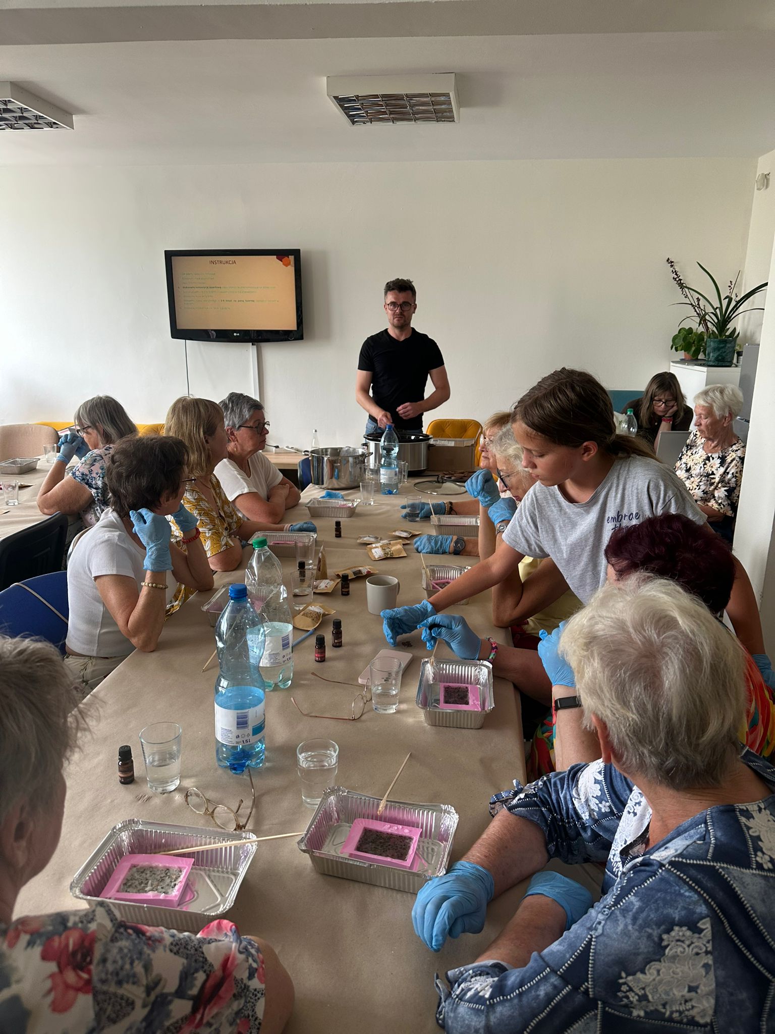 Warsztaty rozpoczęły się od krótkiego wprowadzenia, podczas którego uczestnicy poznali składniki potrzebne do stworzenia naturalnego mydła. Następnie przeszliśmy do praktycznej części — każdy senior mógł samodzielnie połączyć oleje, barwniki naturalne i aromaty, tworząc unikatowe mydła.