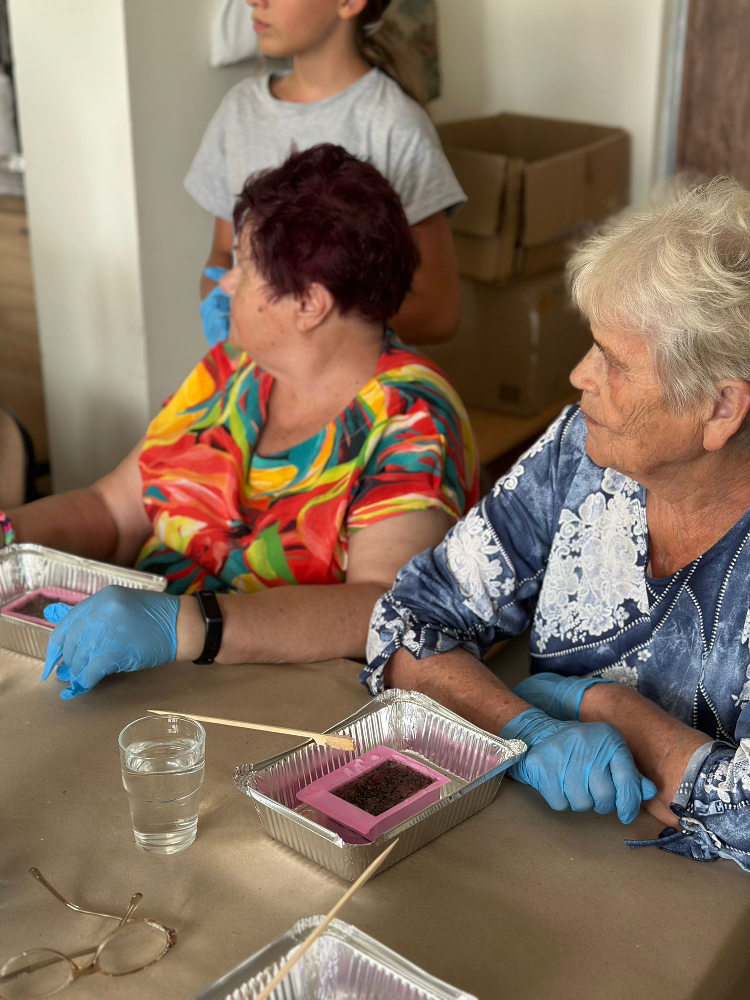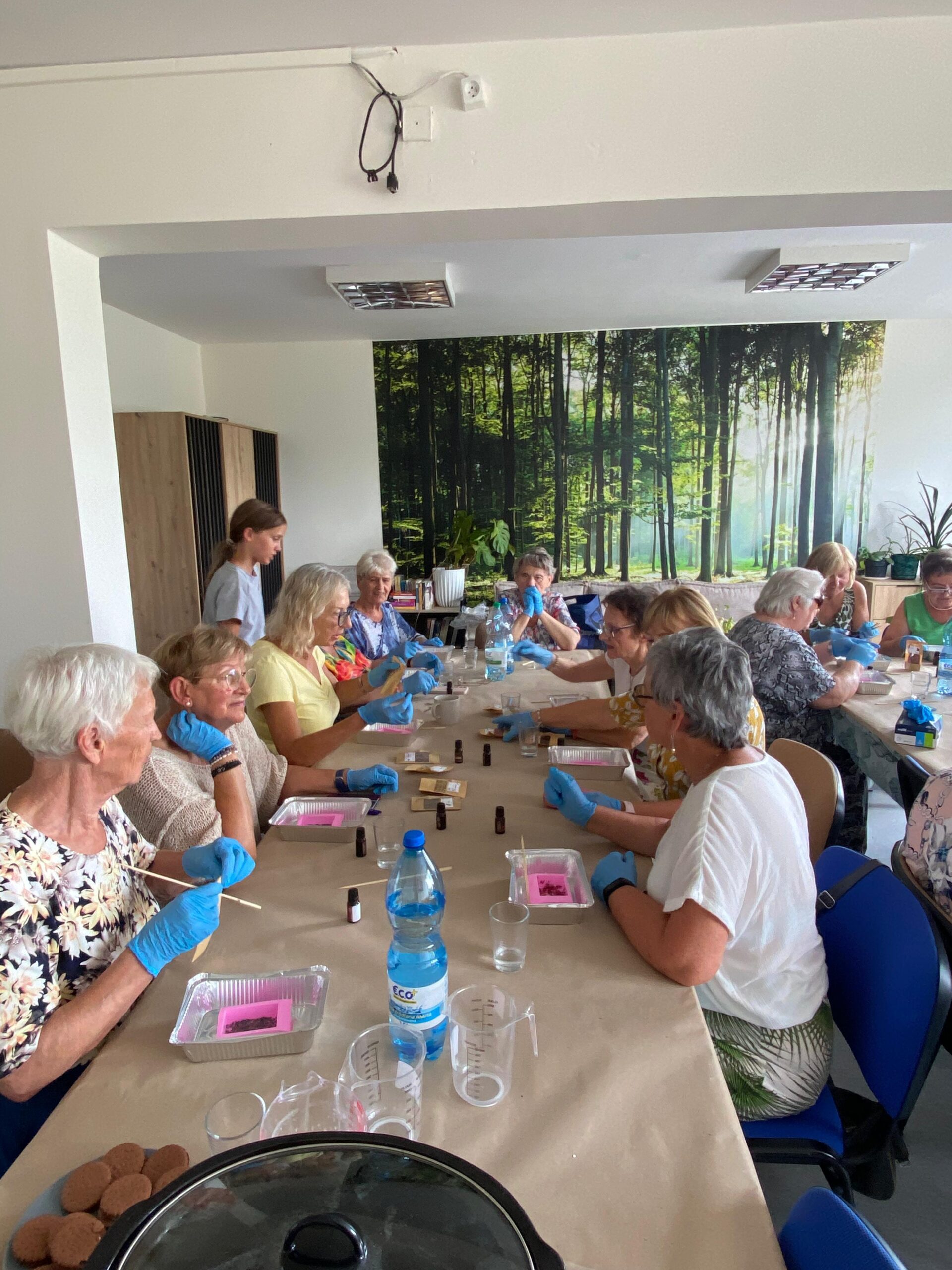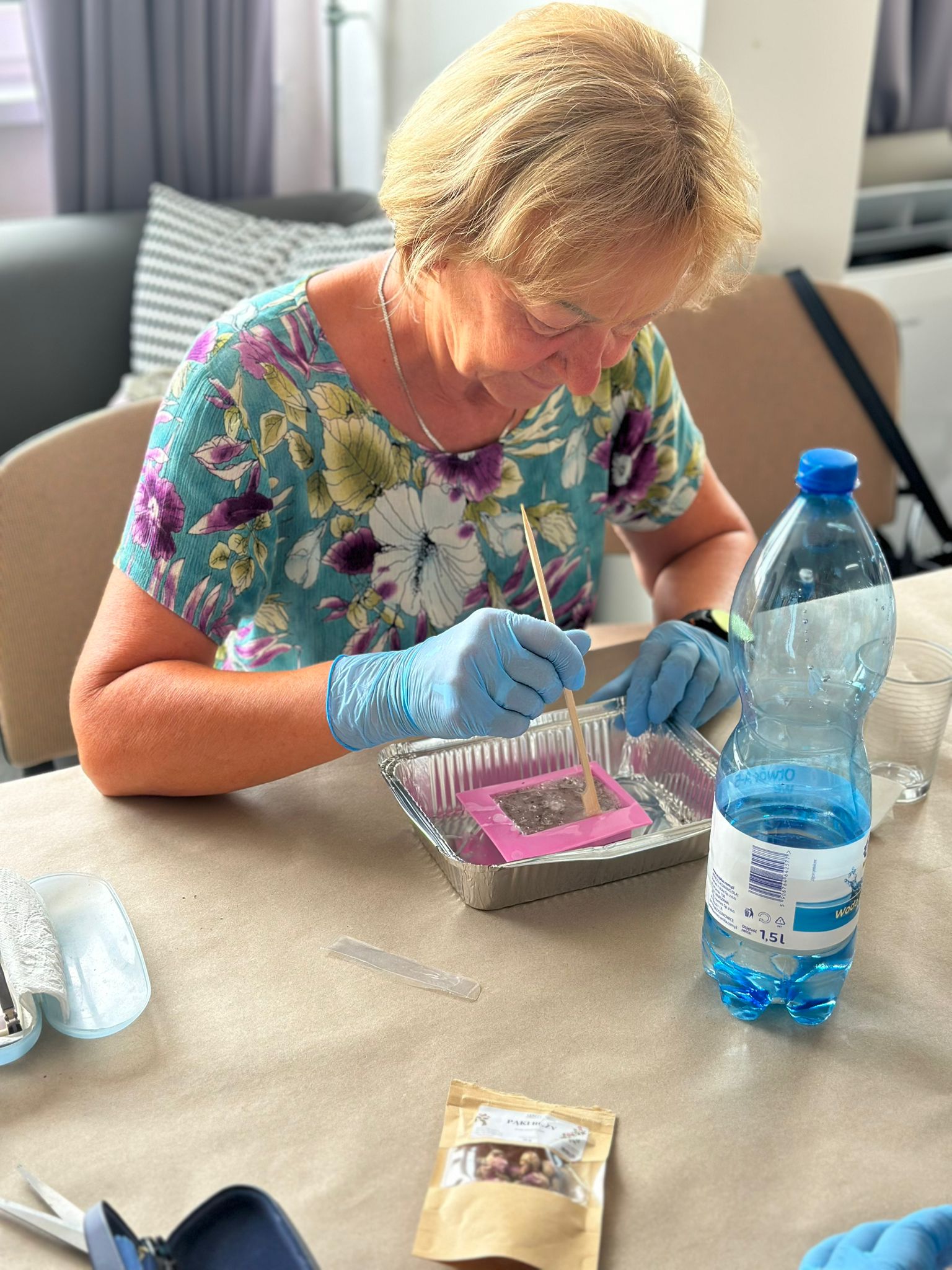 Warsztaty rozpoczęły się od krótkiego wprowadzenia, podczas którego uczestnicy poznali składniki potrzebne do stworzenia naturalnego mydła. Następnie przeszliśmy do praktycznej części — każdy senior mógł samodzielnie połączyć oleje, barwniki naturalne i aromaty, tworząc unikatowe mydła.